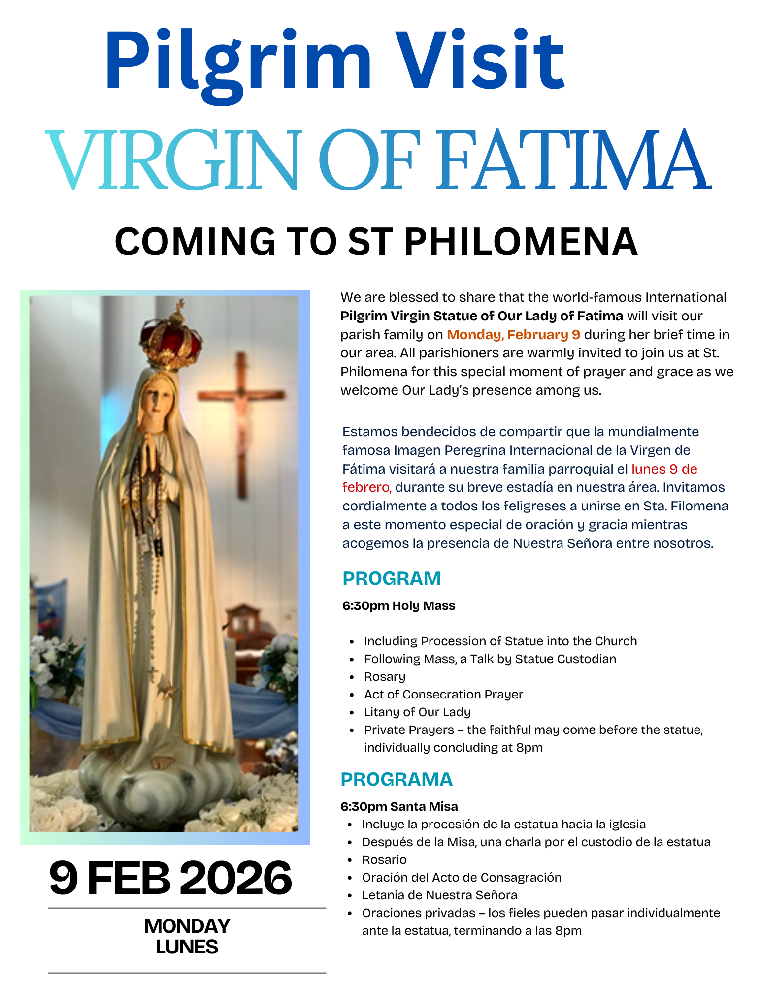 We are the Roman Catholic Faith Community of St. Philomena, called to live the Gospel of Jesus Christ through our celebrating and praying together, through our support of the faith development of each member and through our compassionate service and care for one another and the world. We do this because of our commitment to our faith, our hope in the reign of God and our love of God and neighbor.
